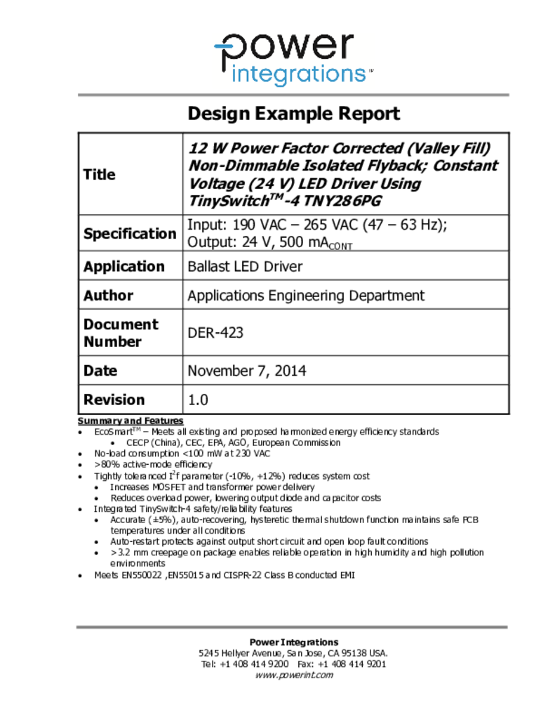 规格 设计类型 设计示例报告(DER) 拓扑 飞回来 VOUT 1 24.00 v vin(最小) 190 VIN(最大) 265 三位线可调状? 不 CV/CC 简历 效率 80.00% 孤立? 是的 输出数量 1 输出功率 12.00 w OVP? 是的 PFC? 是的 相关零件 tny286pg Gerber文件 rd423gerber.zip