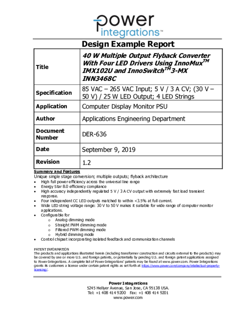 der - 636 - 40 W多个输出电源4领导的电脑显示器的驱动程序使用InnoSwitch3-MX和InnoMux芯片组 40 W多个输出反激变换器(85 VAC - 265伏交流电输入;5 V / 3简历;(30 V - 50 V) / 25 W LED输出;4领导字符串)使用InnoMux (IMX102U)和InnoSwitch3-MX (INN3468C)芯片组 查看PDF 下载 需要登录 MyPI账户需要接收电子邮件通知文档更新。请登录或注册一个帐户继续。 继续 × 更新通知我 BOB体育平台下载 产品 InnoSwitch3-MX InnoMux