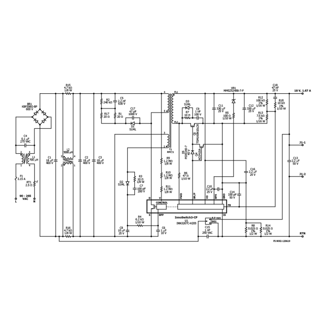 30w隔离反激电源(90 VAC - 265 VAC输入;18 V, 1.67 A输出)用于智能音箱,使用InnoSwitch3-CP (INN3267-H205),具有CV, CC和CP输出选项