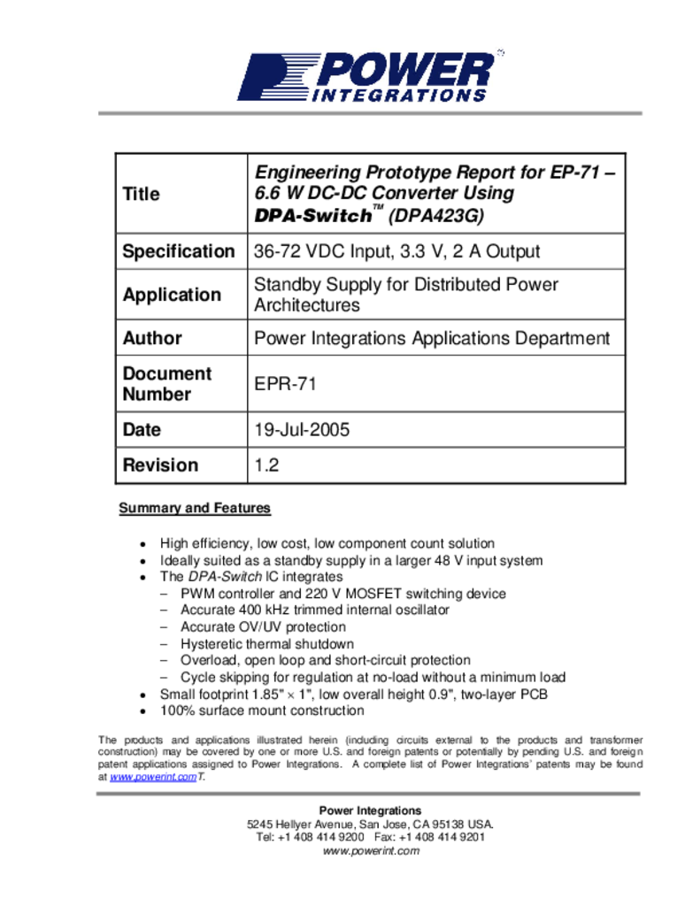 명세서 设计类型 工程原型报告(EPR) 토폴로지 飞回来 rohs? 是的 VOUT 1 3.30 v vin(最小) 36 VIN(最大) 75 CV/CC 简历 절연? 是的 输出数量 1 출력전력 6.60 w 相关零件 DPA423G Gerber文件 ep71gerber.zip