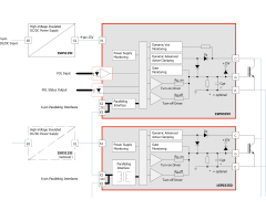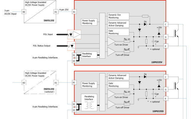 驱动程序概念依赖于主/从属原理,该原理可以安全地操作并行连接的IGBT模块。主(1SP0340V)可以用作无主机的独立驱动程序,以驱动单个IGBT模块,也可以使用最多三个从属(1Sp0340d)来驱动多达四个并行连接的IGBT模块。