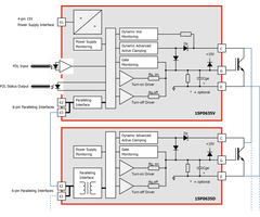 驱动程序在主/从配置中运行,允许并行连接的IGBT模块安全运行。主模块(1SP0635V或1SP0635S)可以作为独立驱动器使用,不带从模块驱动单个IGBT模块,也可以与最多三个从模块(1SP0635D)一起使用,驱动最多四个并行连接的IGBT模块。