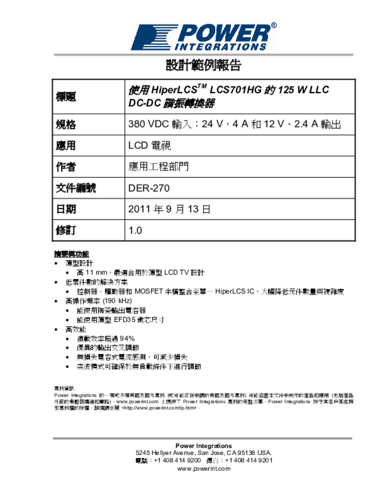 產品規格 設計類型 设计示例报告(DER) 拓撲結構 LLC半桥 RoHS吗? 是的 电压输出1 24.00 V 电压输出2 12.00 V 隔離式? 是的 数量的输出 2 輸出功率 125.00 W 相关的部分 LCS701HG Gerber文件 rd270gerber.zip
